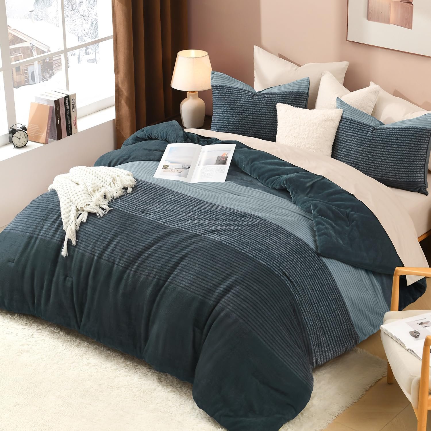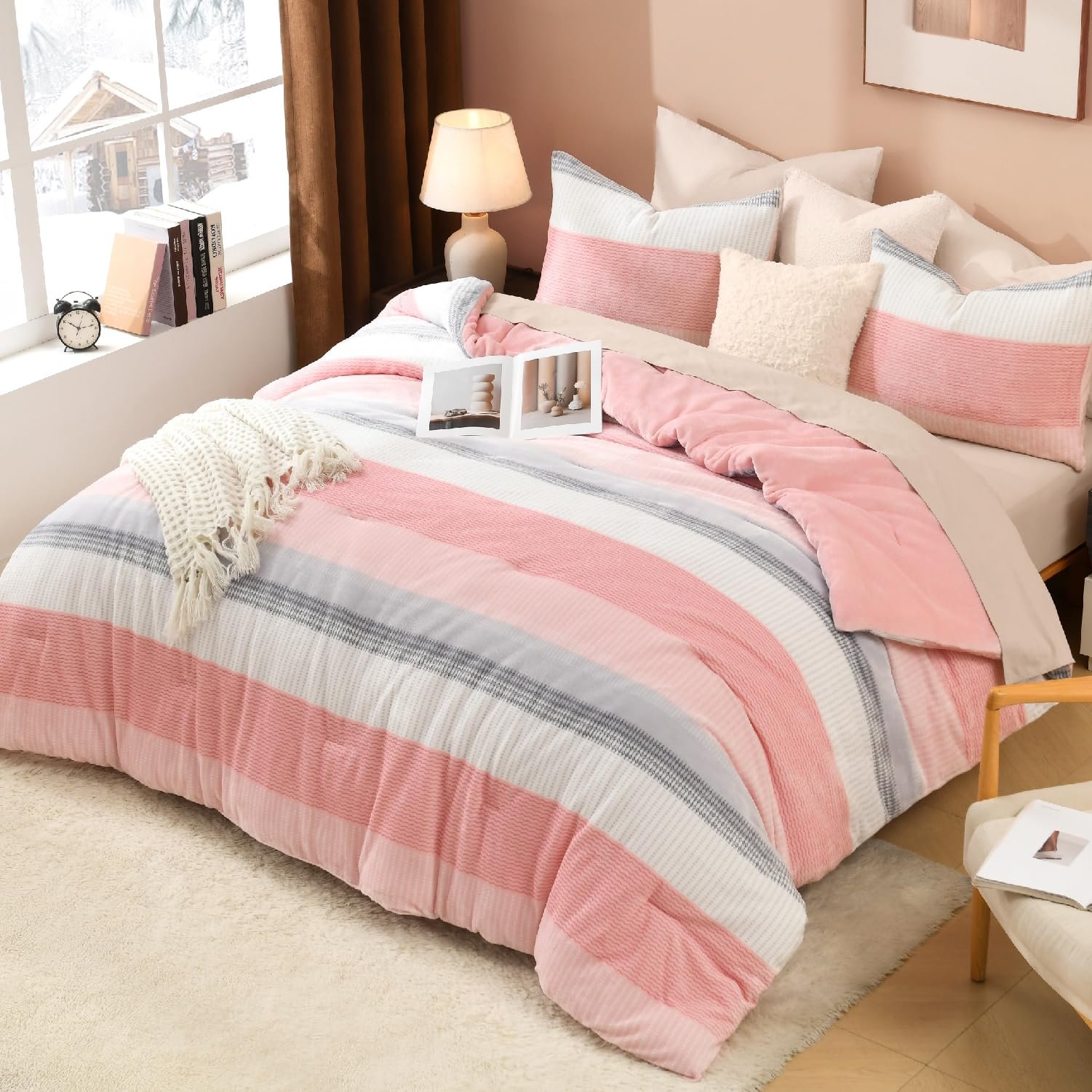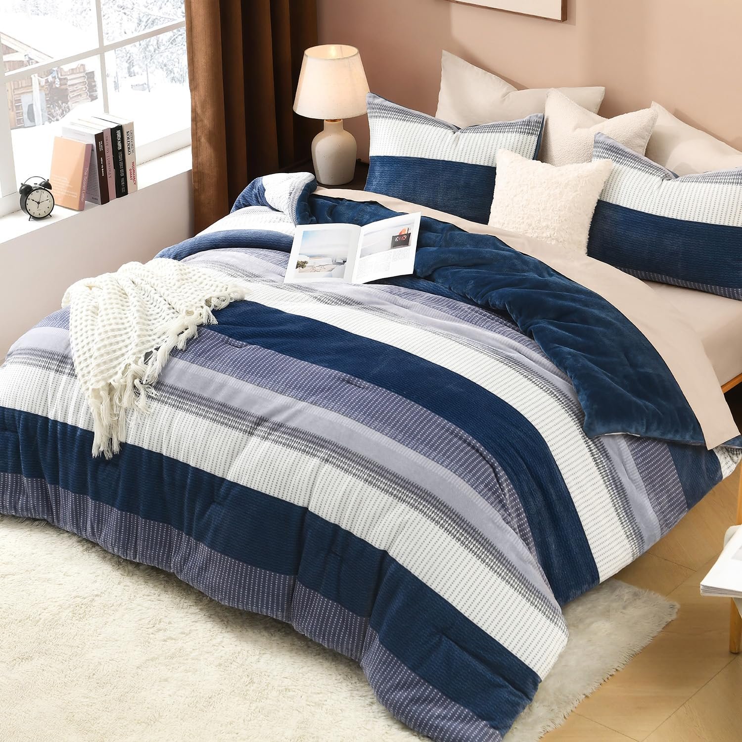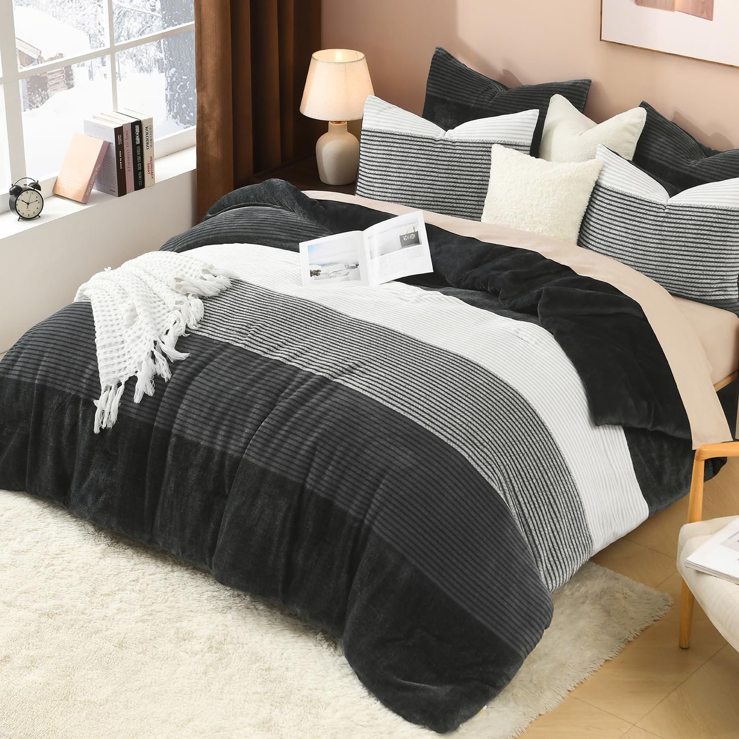 JANESHA LATRICE Fluffy Fleece King Size Comforter Set, Luxury Soft Plush Fuzzy Black & White Stripe Bedding Comforter Sets, Warm Shaggy Faux Fur Bed Set All Season (1 Comforter, 2 Pillowcases)
