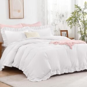 JANESHA LATRICE White Comforter Set Queen Size, Lightweight Fluffy Farmhouse White Ruffle Bedding Set, Soft Microfiber All Season Shabby Chic Bed Comforter Set 3 Pieces(1 Ruffle Comforter 2 Pillowcases)