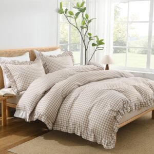 JANESHA LATRICE Gingham Duvet Cover Queen, Tan Brown Ruffle Farmhouse Shabby Chic Duvet Cover, 3 Pieces Soft Pre-Washed Microfiber Duvet Cover Set with Zipper Closure & Corner Ties, 90x90Inch