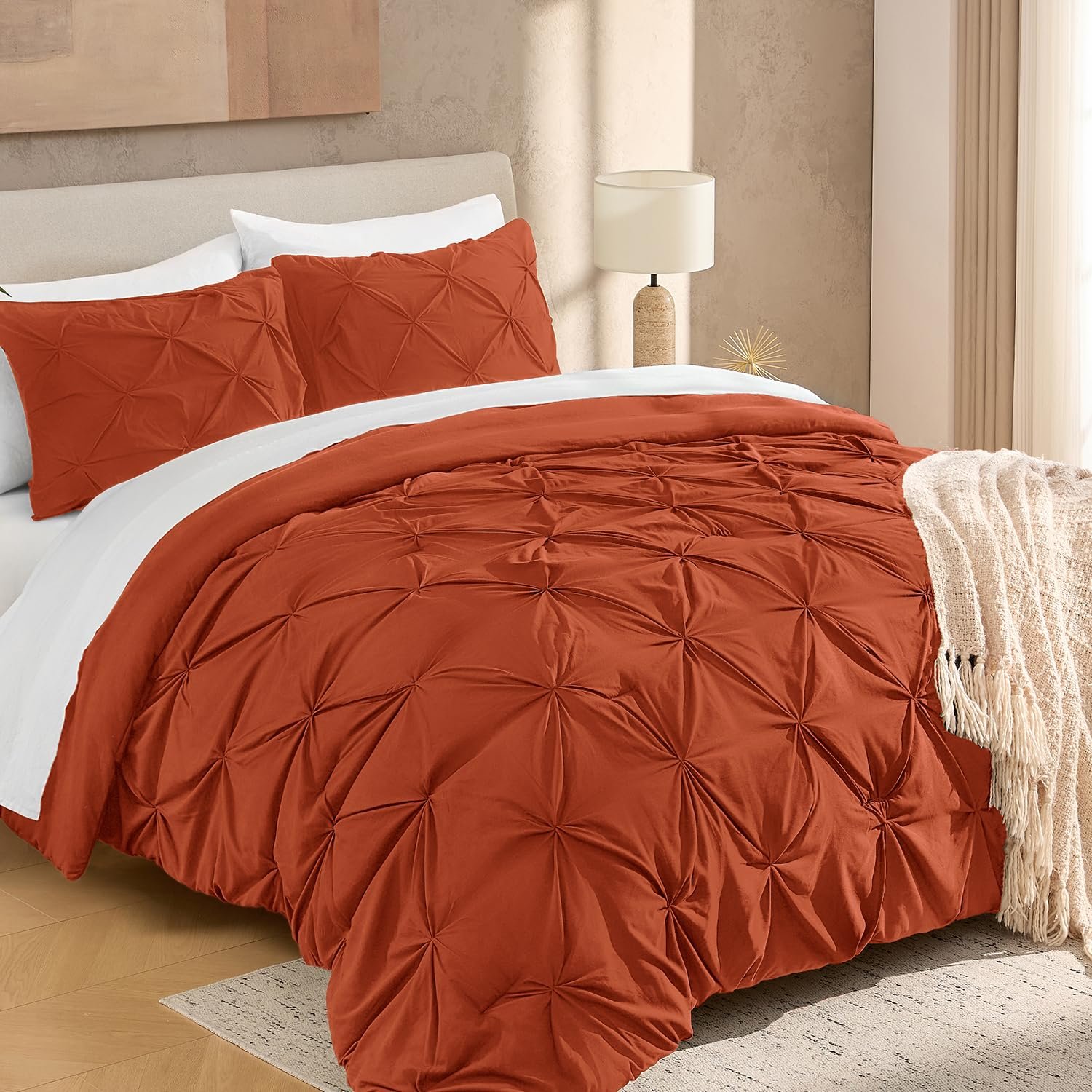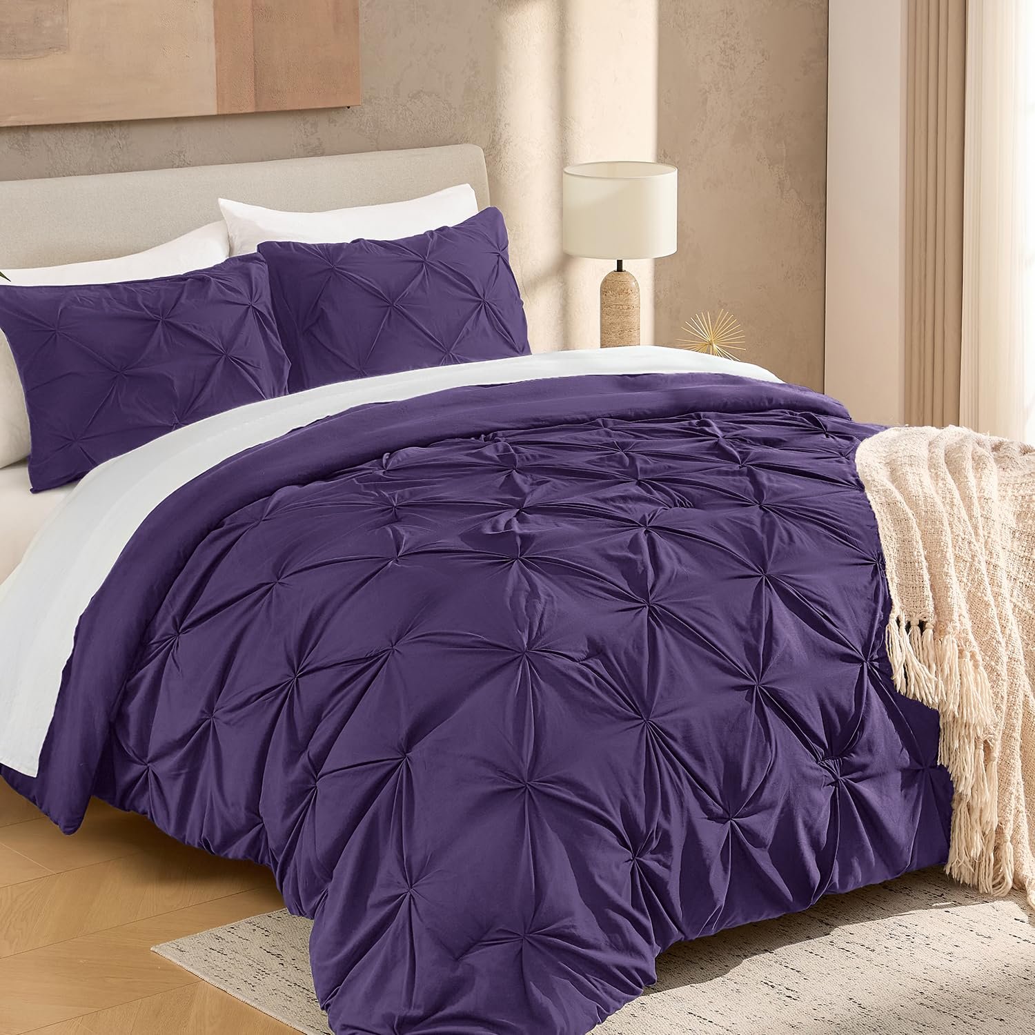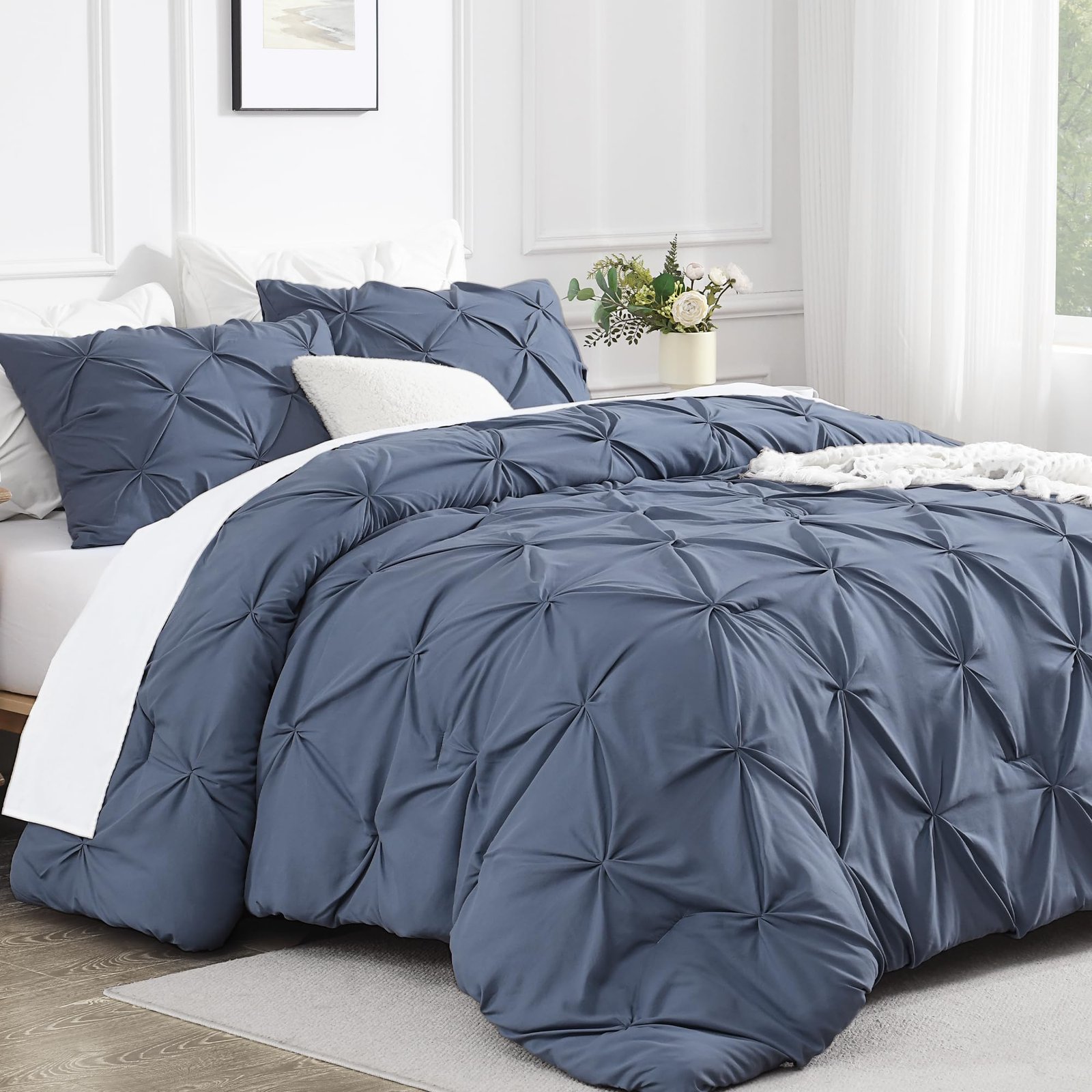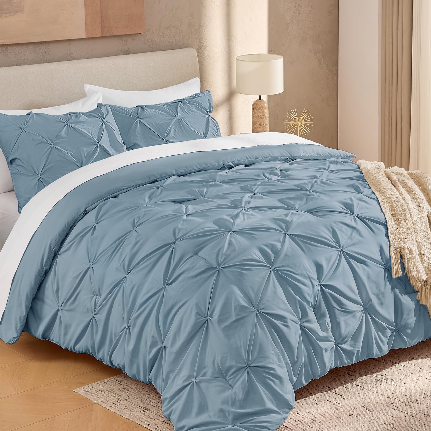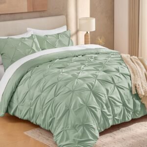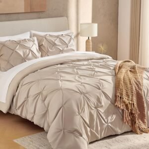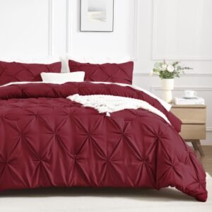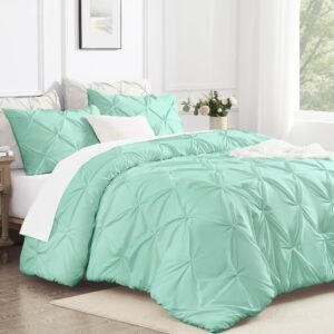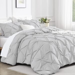 · ALL SEASON SUITABLE: Super soft microfiber bedding set is suitable for all seasons, warm and lightweight. Due to the vacuum packaging, after you get the comforter out, please hold four corners of the comforter to stretch a while and shake it several times, so that the whole comforter could become normal and the pinch pleat design will be more obvious.